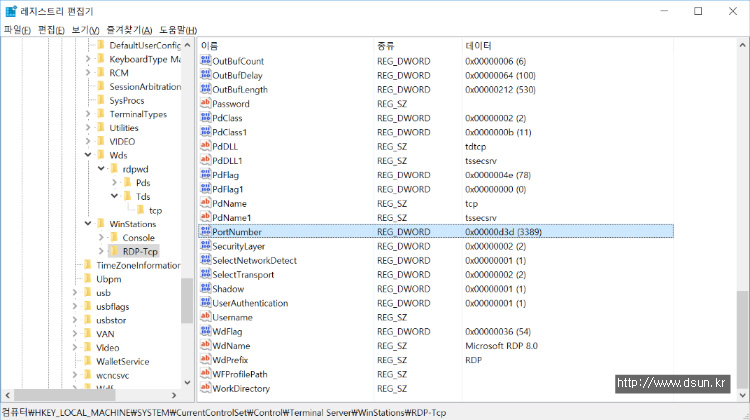 레지스트리(registry) 편집기를 실행하여 포트 번호를 변경