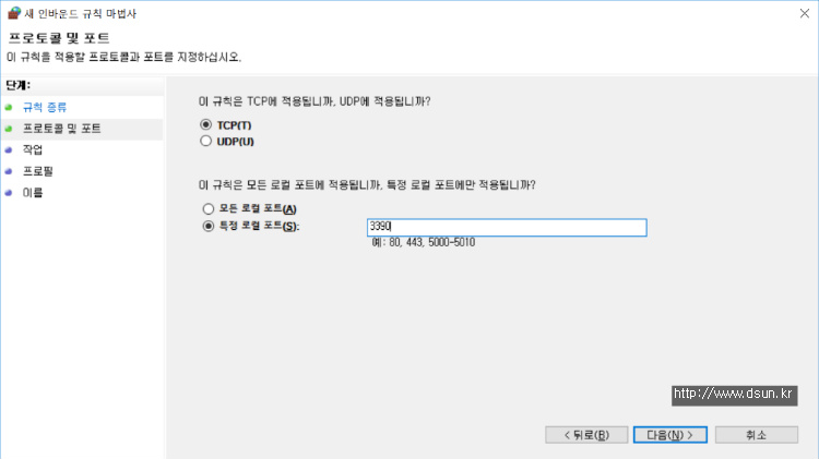 TCP(T)를 선택, 특정 로컬 포트(S)에는 레지스트리 편집기에서 설정한 포트번호를 입력합니다(저는 3390으로 변경 했었습니다). 다음(N) > 버튼을 클릭합니다.