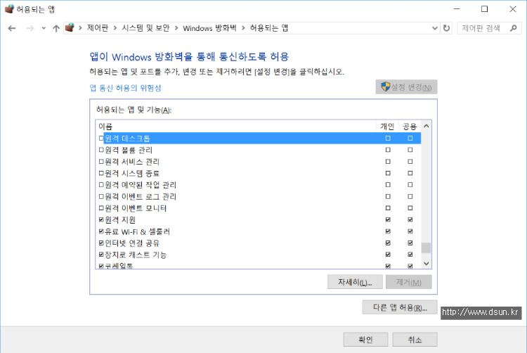 허용되는 앱 및 기능(A)의 리스트 중에 원격 데스크톱을 찾습니다. 허용이 되어 있다면 체크를 해제하여 접근을 차단 시킵니다. 기존의 원격 3389 포트를 차단 시키기 위해서 입니다.