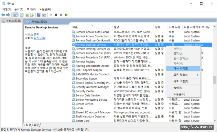 서비스 관리자에서 Remote Desktop Services를 찾습니다. 마우스 오른쪽 버튼을 클릭하고 다시 시작(E)을 실행 합니다. Remote Desktop Services가 중지 되고 다시 실행하게 됩니다.
