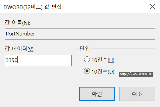 아래 그림과 같은 편집 창이 나타납니다. 단위를 10진수(D)로 선택하면 왼쪽에 값 데이터(V) 부분이 10진수로 변경이 됩니다. 3389에서 다른 포트 번호로 변경 합니다(저는 설명을 위해서 3390으로 변경을 했습니다). 확인 버튼을 눌러 저장을 합니다.