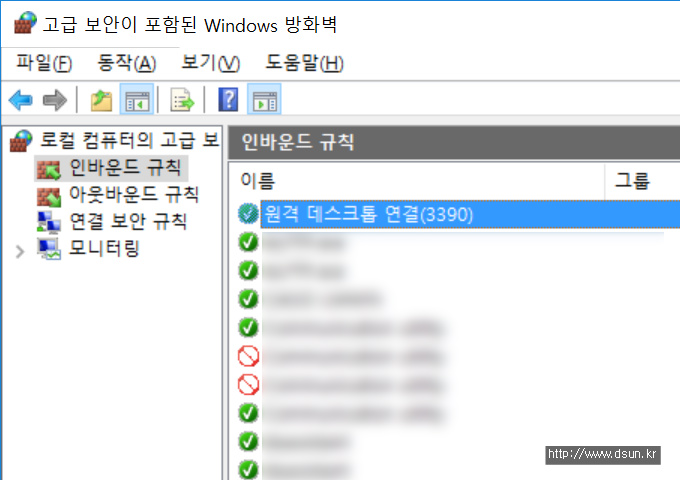 고급 보안이 포함된 WIndows 방화벽 창이 실행 됩니다.