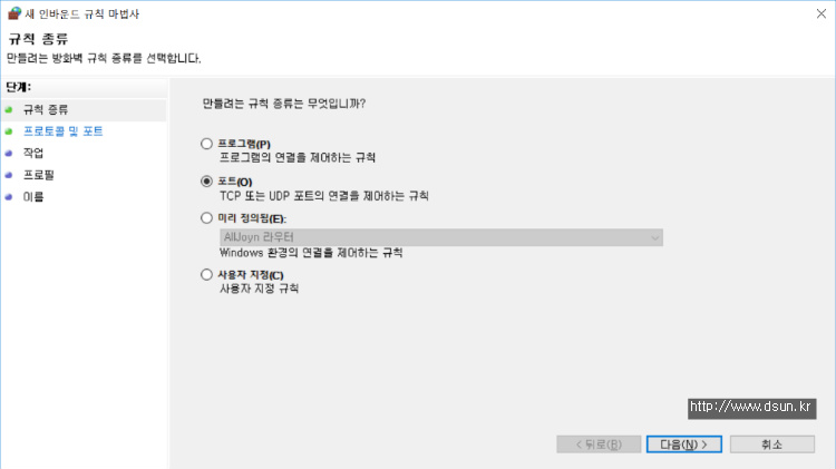 새 인바운드 규칙 마법사가 나타납니다. 포트(O)를 선택하여 다음(N) > 버튼을 클릭합니다.