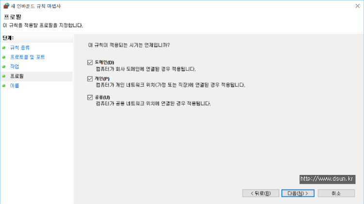도메인(D), 개인(P), 공용(U)를 선택하고 다음(N) > 버튼을 클릭합니다.