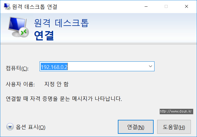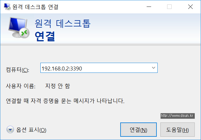 여기까지 작업을 완료 하면 설정한 컴퓨터를 외부에서 원격 데스크톱 연결로 변경된 포트로 접속 할 수 있습니다. 아래 그림과 같이 IP:3390을 입력하여 접속 하실 수 있습니다.