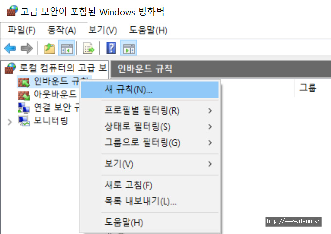 왼쪽에 인바운드 규칙(외부에서 내부로 접근)에서 오른쪽 마우스 버튼을 클릭하고 새 규칙(N)을 실행 합니다.