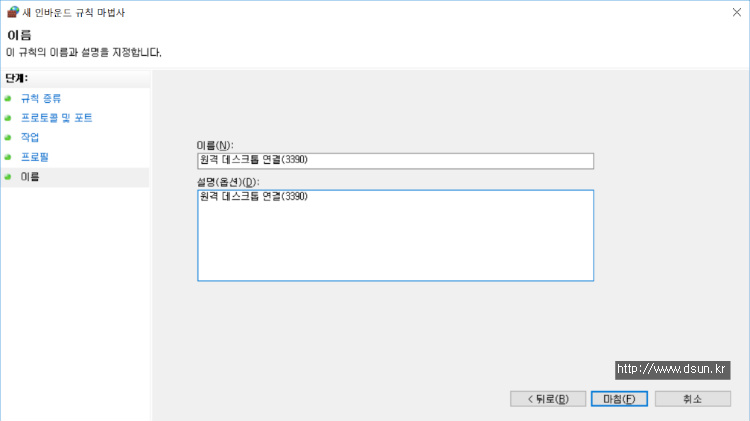 규칙에 대한 이름을 입력합니다. 저는 이름(N), 설명(옵션)(D)에 원격 데스크톱 연결(3390)로 입력했습니다. 마침(F) 버튼을 클릭하여 완료합니다.