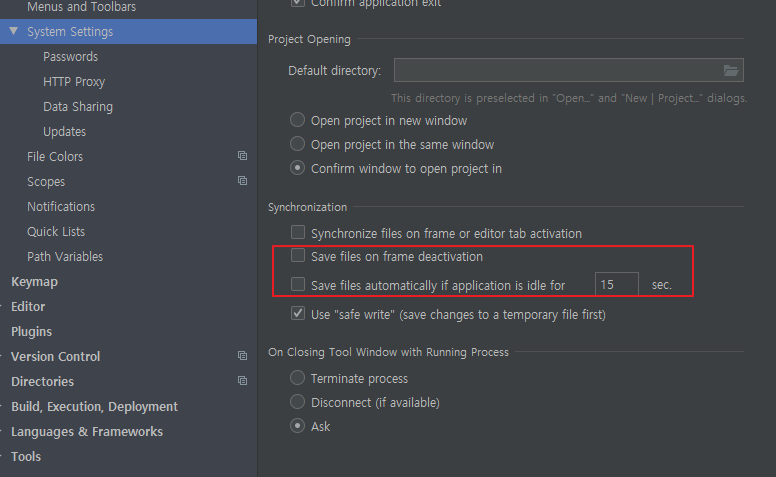 File >Settings > Appearance & Behavior > System Settings -> Synchronization
