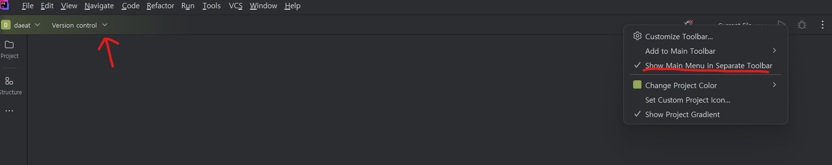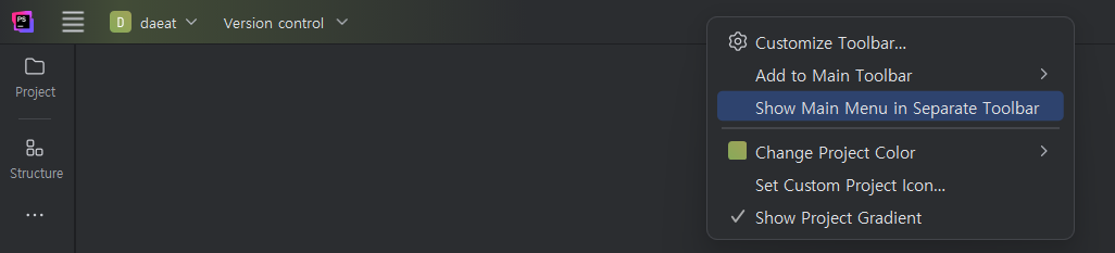 아래 BAR에서 오른쪽 마우스 > Show main Menu in Speparate Toolbar 클릭으로 메뉴 바를 나오게 하는게 최선인듯?