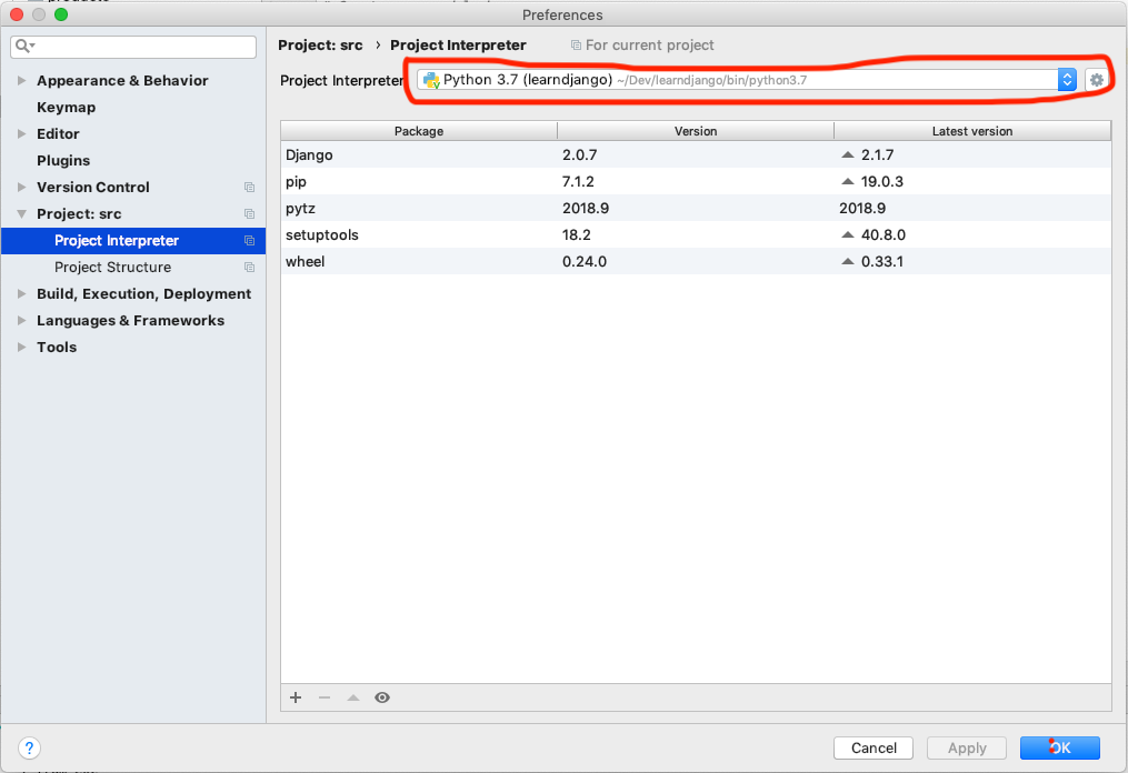 Project Interpreter 를 가상환경경로(venv)로 설정