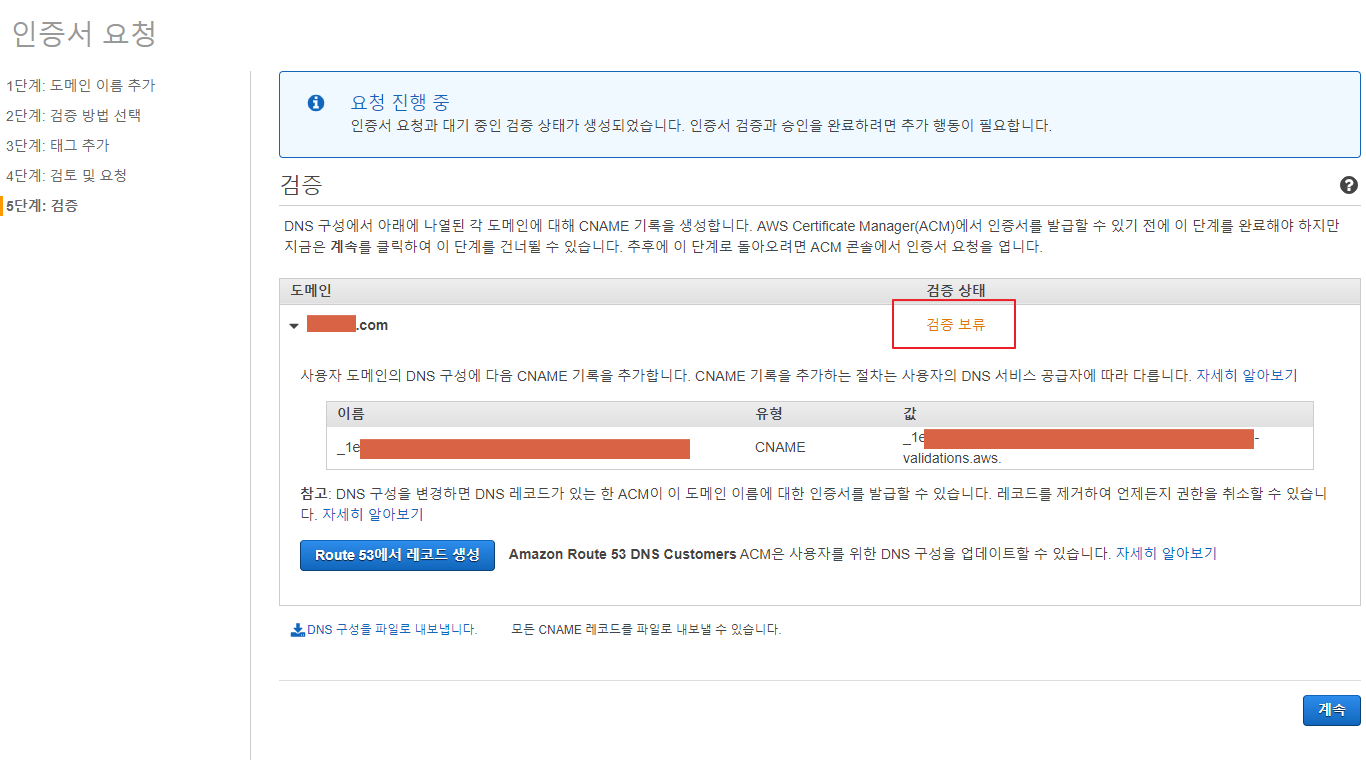 Route 53에서 레코드 생성 버튼을 클릭해서 검증 완료 처리를 해줘야 함.