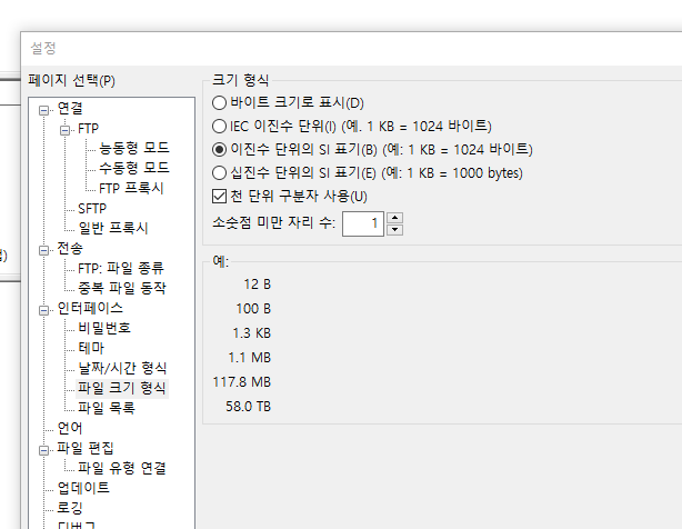 설정 > 인터페이스 > 파일 크기 형식 > 이진수 단위의 SI표기 체크
