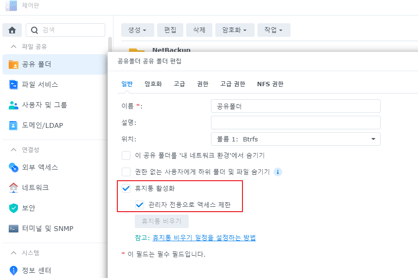 제어판>공유폴더>휴지통 활성화 (관리자 전용으로 엑세스 제한)