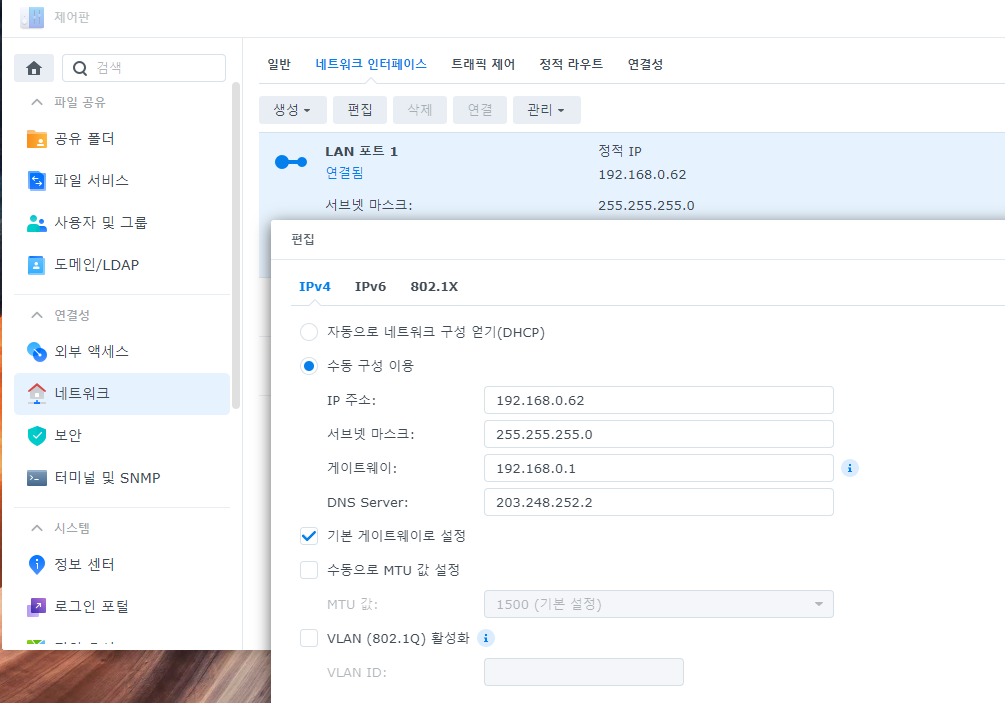 나스>제어판>네트워크>네트워크인터페이스>편집