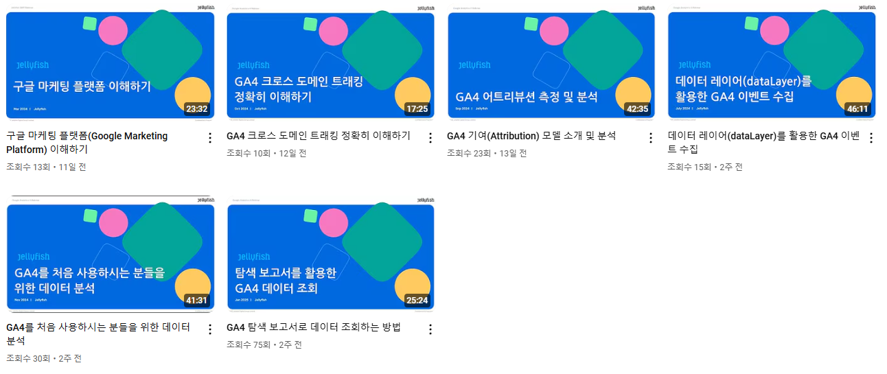 구글 마케팅 플랫폼 공식 세일즈 파트너 젤리피쉬(Jellyfish) 한국 지사 유투브입니다. 매월 진행하는 GA4 웨비나 다시보기 영상을 유투브 채널을 통해 제공합니다.